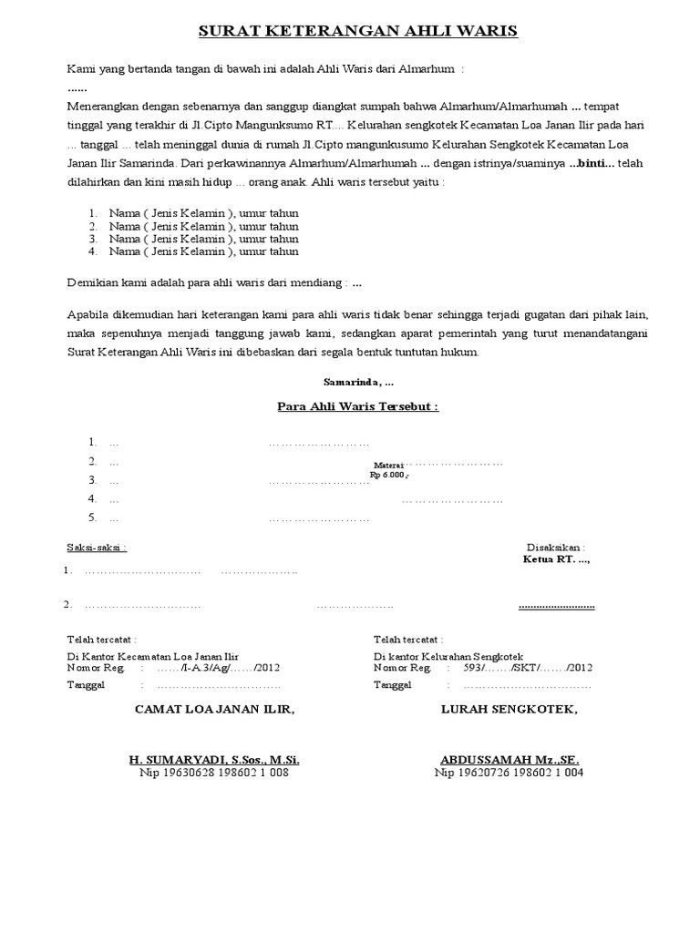 Anda sedang membuka postingan contoh surat pernyataan ahli waris yang berada pada kategori berikut ini contoh surat yang baik dan benar serta menarik perhatian yang dapat anda gunakan. File draf surat kuasa ahli waris ini berisi pemberian kuasa dari para ahli waris untuk melakukan file draf surat kuasa ahli waris ini dapat dimodifikasi sesuai dengan kebutuhan dan kepentingan. Entah apa kegunaan kegunaan surat keterangan ahli waris ini, saya tidak begitu nah mari langsung saja kita lihat, contoh surat keterangan ahli waris ini, untuk download seperti biasa link sudah saya. Surat keterangan waris adalah surat yang diberikan oleh pemilik warisan kepada ahli warisnya. Contoh surat waris dengan berbagai kasus.